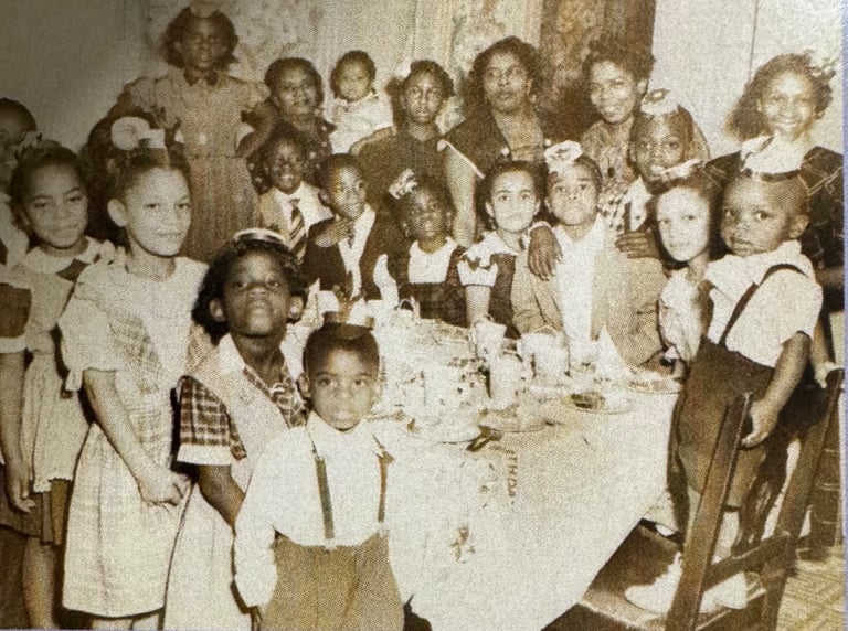 King Family of matriarchs hosting Cousin Dorothy’s (standing on chair) Birthday party in their multi family home. Location: 121 Farson Street, Philadelphia, PA (photo 1953)